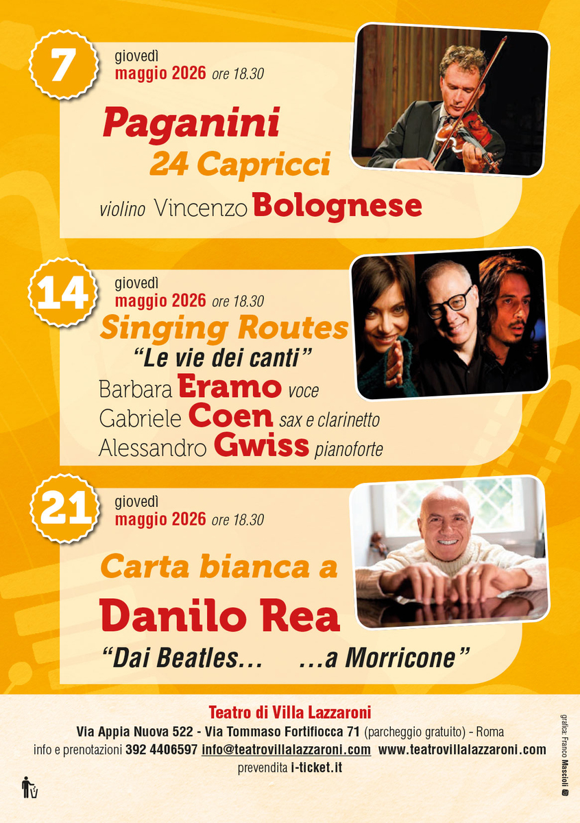 Giovedì 14 maggio è la volta del trio formato da Barbara Eramo (voce), Gabriele Coen (sax) e Alessandro Gwis (pianoforte), che presenterà “Singing routes, le vie dei canti”: è un progetto con cui i tre musicisti seguono come filo conduttore l’identità culturale ed i suoi percorsi, attraverso la rivisitazione con un approccio aperto e contemporaneo di brani tradizionali del folk mediterraneo e del jazz. Giovedì 21 maggio si darà ‘carta bianca’ a Danilo Rea, con la sicurezza di affidarsi alle ottime dita e al talento musicale di un pianista jazz (ma la definizione gli va un po’ stretta) letteralmente straordinario, che ci guida in percorsi sempre affascinanti: il titolo del suo concerto è “Dai Beatles… a Morricone” e ci si può affidare ad occhi chiusi alle sue scelte. Finale pirotecnico e diabolico con i Capricci per violino solo di Paganini: Questi ventiquattro brevi brani super virtuosistici hanno dato origine alla leggenda del patto col diavolo del violinista genovese, ma Vincenzo Bolognese sa come - e non ce ne sono molti altri - far convivere l’esibizione virtuosistica e la valorizzazione della sostanza musicale di questa splendida raccolta di ventiquattro brani per violino solo.