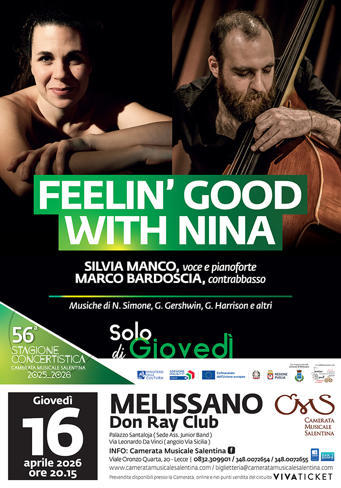 Sul palco il duo formato da Silvia Manco (voce e pianoforte) e Marco Bardoscia (contrabbasso), protagonisti del progetto “Feelin’ Good with Nina”, dedicato alla straordinaria eredità musicale di Nina Simone, artista capace di attraversare e fondere jazz, blues, soul, musica classica e canzone d’autore con uno stile inconfondibile.
