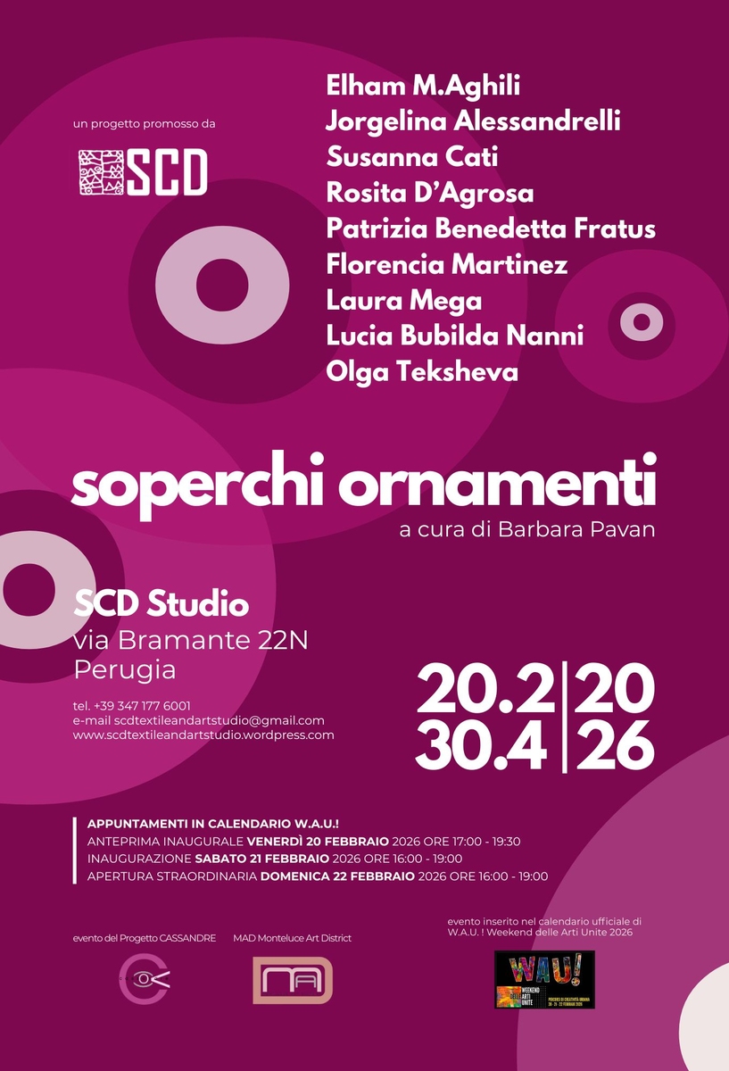 Dal 20 febbraio al 30 aprile 2026, SCD Studio presenta SOPERCHI ORNAMENTI, progetto espositivo a cura di Barbara Pavan ospitato negli spazi di via Bramante 22N, all’interno del MAD Monteluce Art District di Perugia.